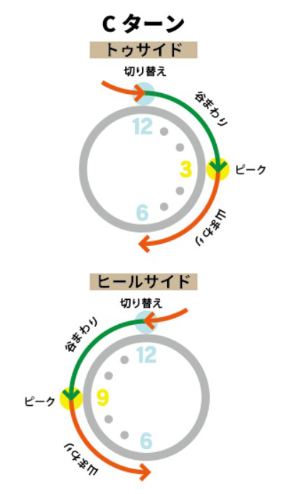 Cターンは山側のエッジを使った状態からスタートし、12時の位置で谷側のエッジに切り替え、板の向きを変えながら6時の位置まで滑っていくターンです。
