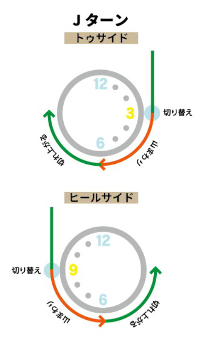 12時がスタートでトゥサイド(フロントサイド)は3時、ヒールサイド(バックサイド)は9時がターンのピークとなり、6時に向かってターンを続けます。