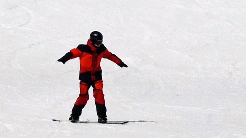 細長いターンでかまわないので、緩斜面で少しスピードを出しながらエッジに乗ってターンをしてみてください。