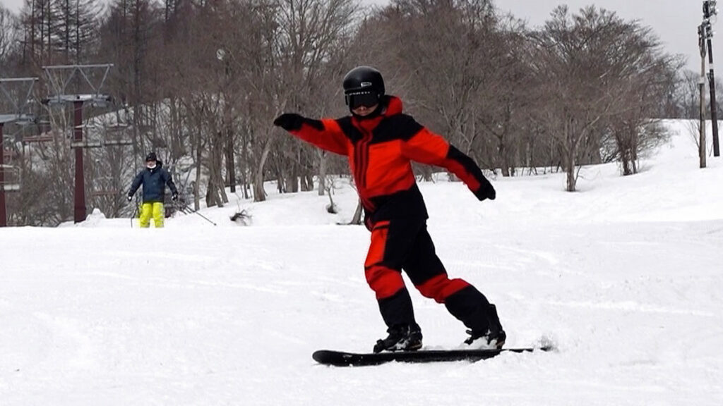 板の向きを変えていくときに、少し目線を先行させながら上体が内側に倒れないようにリーンアウトを意識するのがバランスを取るためのコツです。