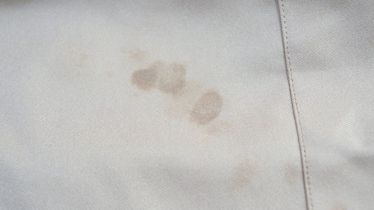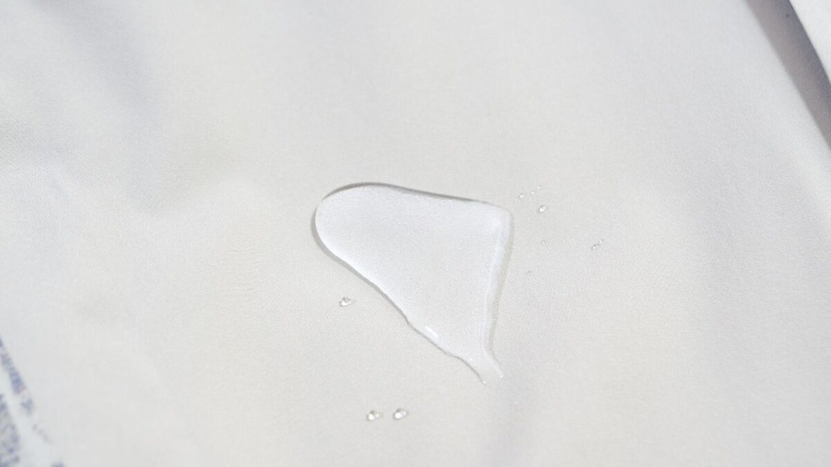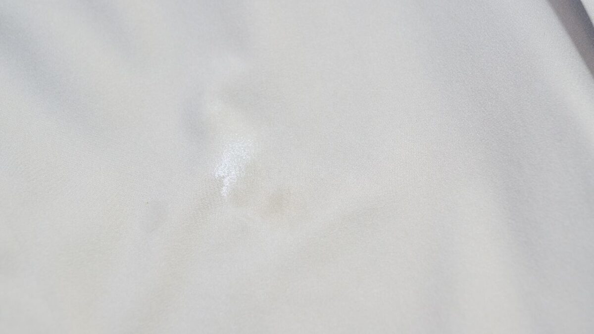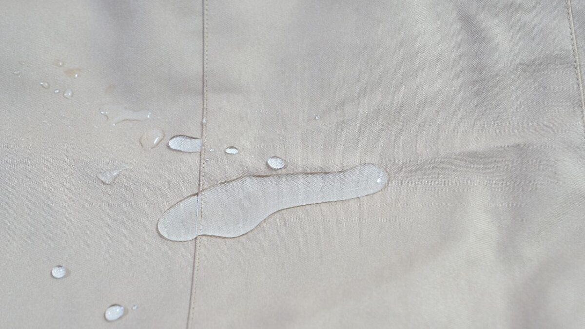 水をこぼした状態で、あえて指でグイグイ押して水をしみ込ませてみました。写真のように水が生地内にしみ込んでいきますが、この状態で内部にまで浸透しません。